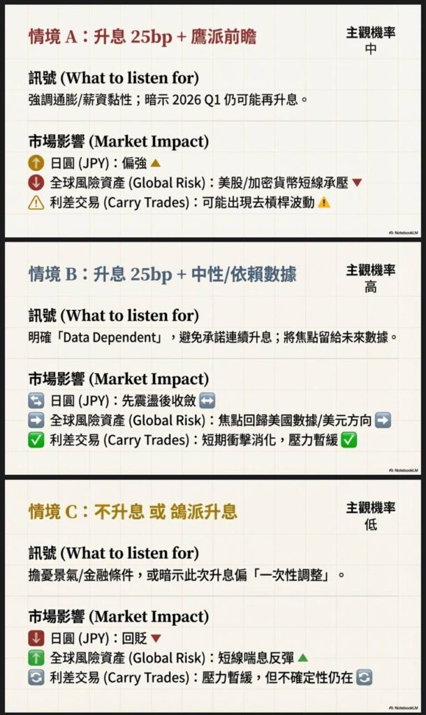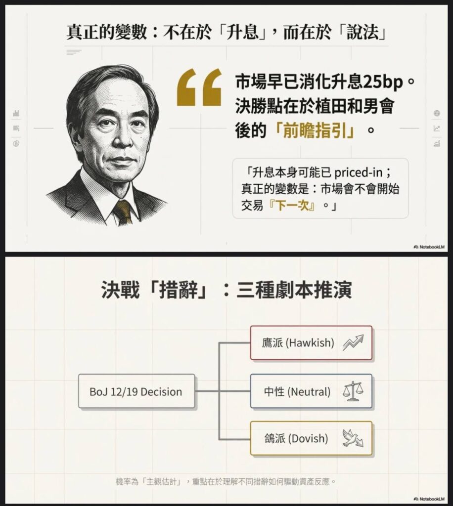 對於敏銳的交易員來說,升息 25bp 本身可能已經被市場消化(Priced-in)。真正的決戰點在於日本央行總裁植田和男在會後的「前瞻指引(Forward Guidance)」。