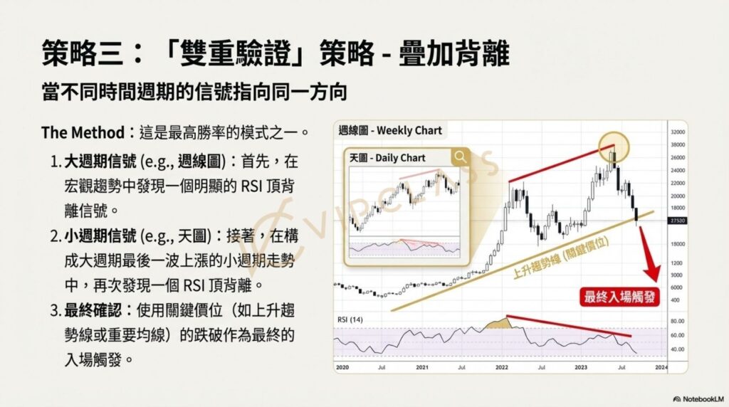 - 策略三:雙重驗證策略(疊加背離) 這是最高勝率的模式。當大週期(週線)與小週期(天圖)同時指向同一個方向的背離信號時,配合關鍵價位執行交易。