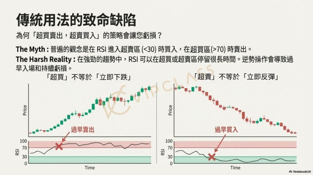 - 突破傳統:RSI 達 70(超買)或 30(超賣)不代表立即反轉,而是動能警示。