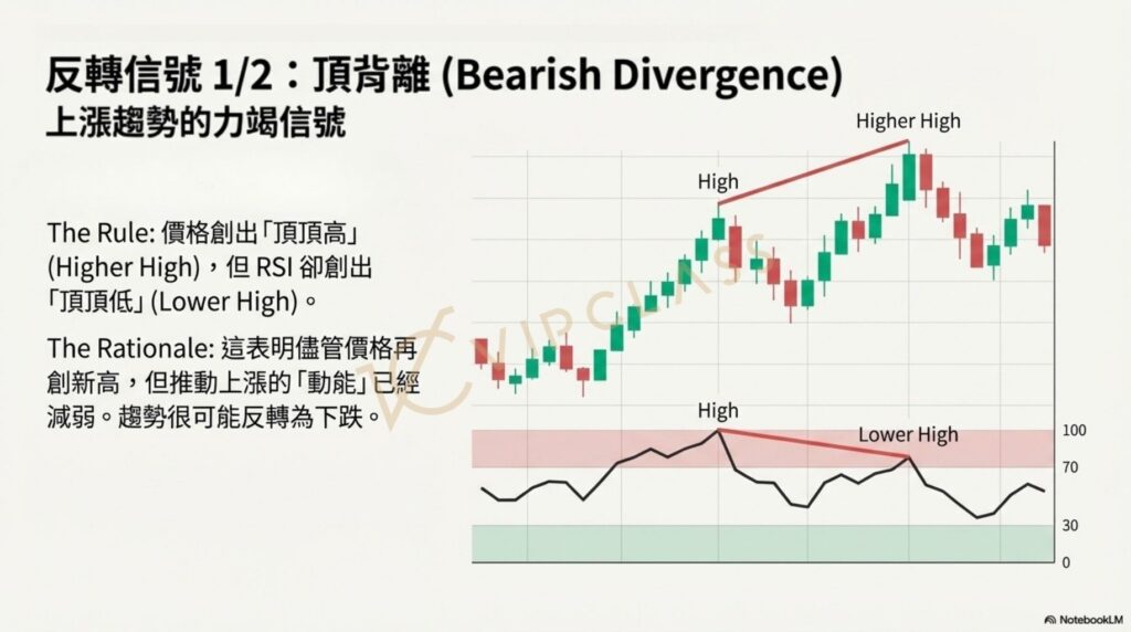 - 頂背離 (Bearish Divergence):當價格創出「頂頂高」,但 RSI 卻呈現「頂頂低」。這代表上漲動能已減弱,趨勢很可能反轉下跌。