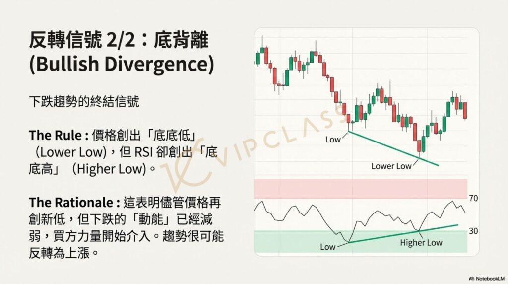 - 底背離 (Bullish Divergence):當價格創出「底底低」,但 RSI 卻呈現「底底高」。這是買方開始介入、趨勢可能反轉上漲的信號。